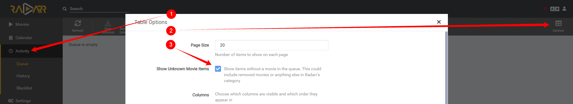 By enabling the following option it will show items without a matched movie in the queue. This could include removed movies or anything else in Radarr's category.